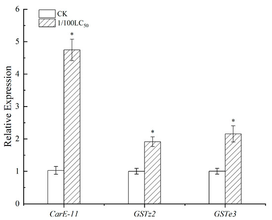 Effects of thiamethoxam on expression of detoxification genes in the midgut of silkworms. Transcription levels of carboxylesterase (CarE) family gene (CarE-11) and two glutathione S-transferase (GST) genes (GSTe3 and GSTz2). Data are shown as mean ± SEM. The significance of the difference is indicated and expressed as *. (p < 0.05).