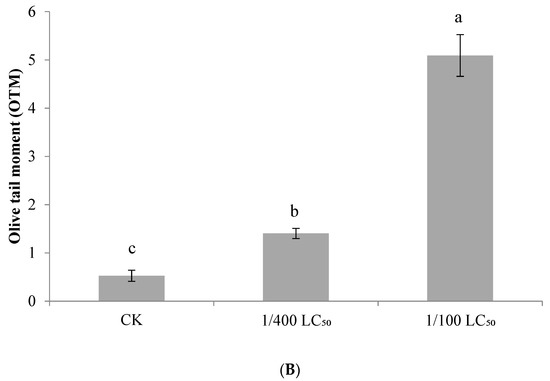 Comet experiment of thiamethoxam in silkworms. (A) Comet test of silkworm body cells under different concentrations of thiamethoxam, (a) CK, (b) nuclei of silkworms under 1/400 LC50 of thiamethoxam, (c) nuclei of silkworms under 1/100 LC50 of thiamethoxam. (B) The effect of exposure to different concentrations of thiamethoxam on the comet olive tail moment (OTM) of the silkworm body cavity cells in 5 days, the significant differences are represented between different letters (p < 0.05).