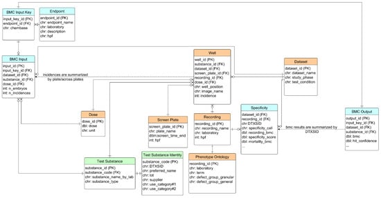 A relational database, called SEAZIT, was constructed using the PostgreSQL data management system. The tables in the database can be separated into three groups: substance information, screening data, and analyses (Figure 1). Starting with the test table comprising 42 substances, the identity information was stored in the table of test_substance_identity, including the fields of DTXSID (from US EPA Chemical Dashboard, https://comptox.epa.gov/dashboard/, accessed on 10 April 2023), lot, supplier, and use_category information. The screening data group includes six tables: well, dataset, recording, screen_plate, dose, and phenotype_ontology, where the well table is central in connection with others. The incidence data from the well data were summarized to the endpoint data for the table of BMC_input, either by plate (for blinded substances) or across plates (for PC). The table of BMC_input_key stores the unique combination of the endpoint and the aggregated chemical information. The input data were analyzed using the BMC modeling approach, and the generated BMC, BMR, and other relevant activity metrics were stored in the table of BMC_output. The specificity analysis was applied on the BMC_output data and the results were stored in the table of specificity and were linked back to the table of recording.