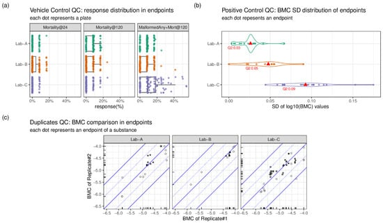 Quality check (QC) analysis for vehicle control (VC), positive control (PC), and duplicates (3 compounds, each of them has two substances) across three laboratories. (a) The response (%) distribution of three endpoints (Mortality@24, Mortality@120, MalformedAny+Mort@120) based on the response (%) from each plate of wells where embryos treated with only VC. (b) The distribution of standard deviation (SD) of the benchmark concentration (BMC) values of PC in all 120-hpf endpoints. Q2 represents the second quartile (median) of the distribution. (c) The BMC comparison of duplicates in all 120-hpf endpoints. The BMC is in log10(molar concentration) unit. The blue lines are diagonal lines with slope = 0, 1, −1 and intercept = 0. The blue dotted lines are diagonal lines with slope = 0.5, −0.5 and intercept = 0. The shape represents the three compounds: hollow circle as aldicarb; solid circle as bisphenol A; asterisk as valproic acid. Only BMC values different in replicate#1 and replicate#2 were kept in (c).