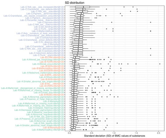 The distribution of the standard deviation (SD) values (dot) of BMC values of substances of endpoints in three laboratories (Lab-A: green; Lab-B: orange; Lab-C: blue). The endpoints were sorted based on the median value of the SD distribution.