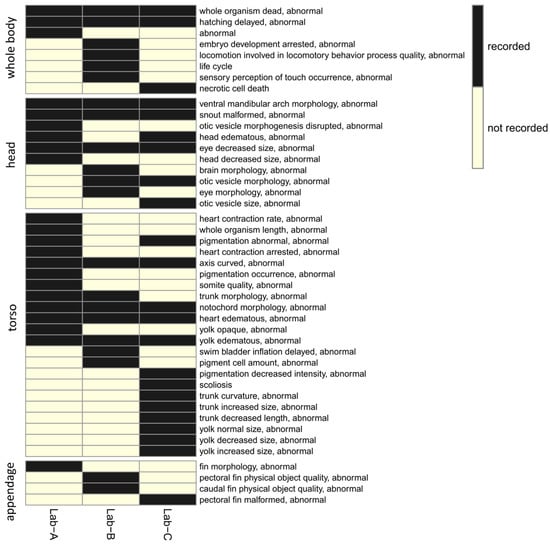 In addition to the task of comparing the potency of identified developmental toxicants across laboratories, SEAZIT’s Interlaboratory study also sought to compare altered phenotypes induced by developmental toxicants across laboratories in terms of the sensitivity of substance-induced altered phenotypes. However, laboratories reported their findings using their own terminology. A recent publication of SEAZIT calls for greater uniformity in data reporting across laboratories []. Therefore, in this study, we mapped the altered phenotypes recorded using individual in-house laboratory terms to available zebrafish phenotype ontologies. This mapping allows the direct comparison of altered phenotypes between laboratories by translating findings into the same terminology.