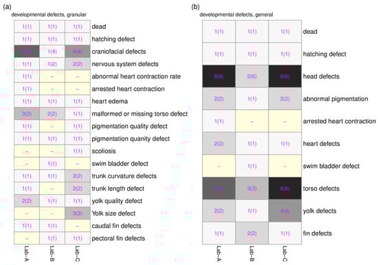 For all 44 ontology terms, only 8 ontology terms (whole organism dead, abnormal; hatching delayed, abnormal; ventral mandibular arch morphology, abnormal; snout malformed, abnormal; eye decreased size, abnormal; axis curved, abnormal; notochord morphology, abnormal; heart edematous, abnormal; yolk edematous, abnormal, in Figure 4) were recorded by all three laboratories, indicating that the recorded altered phenotypes between laboratories had limited overlap (Figure 4). The lack of overlap prompted us to create higher level ontology groups (developmental defects (granular) and developmental defects (general)). In total, 18 groups and 10 groups were created for developmental defects (granular) and developmental defects (general), respectively. The overlaps of the ontology groups between three laboratories were plotted using the heatmaps in Figure 5a,b. With the ontology groups, 9 out of 18 groups (developmental defects (granular)) and 8 out of 10 groups (developmental defects (general)) have a complete overlap across three laboratories. These additional groupings allow for comparative analysis of chemical-induced altered phenotypes across all three laboratories.