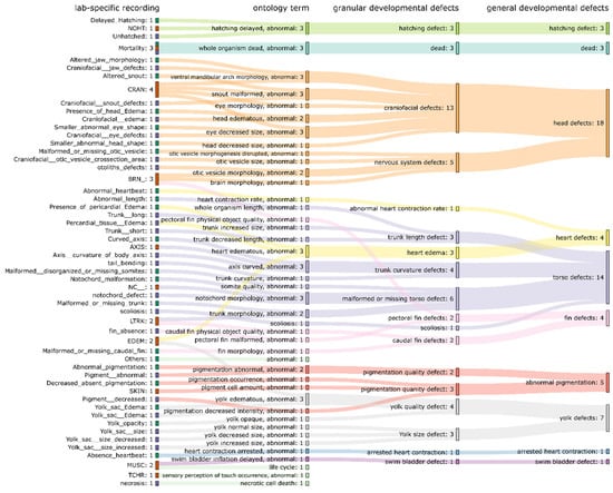 To visualize the hierarchical relationship of components in zebrafish altered phenotype ontology (recordings from each laboratory → mapped ontology terms → developmental defects (granular) → developmental defects (general)), the Sankey diagram (Figure 6) was created. In Figure 6, we can see how each recorded altered phenotype is connected to the mapped ontology terms, then to ontology groups (developmental defects (granular) and developmental defects (general)). The head defects (in developmental defects (general)) contains the largest number of recorded phenotypes and includes a total of 18 recorded altered phenotypes from three laboratories, followed by torso defects (14 recorded altered phenotypes).