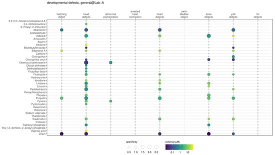 To compare the specificity results across laboratories, the recorded altered phenotypes were first mapped to the ontology terms, then the results of the ontology terms were collapsed into the groups of developmental defects. To select a representative result for each developmental defect group if multiple altered phenotypes were included, the results from the class of ‘specific’ were used first, followed by ‘non-specific’, ‘inconclusive’, and ‘non-toxic’. One example of data collapsing for head defects is shown in the Supplemental Figure S5 using a substance (abamectin) tested in Lab-A. To resolve ties (e.g., two ‘specific’ classes), the most potent BMC of the class was reported. The results are presented in Figure 7 and Figure S6. In Figure 7, the developmental defect group for head defects looked to be most sensitive in Lab-A, followed by yolk defects, heart defects, torso defects, hatching defects, and abnormal pigmentation. No substances (out of 39 substances) caused arrested heart contraction and fin defects in Lab-A DRF data. In Lab-C, the profile appeared to be similar to Lab-A, in that no substances caused fin defects. However, in Lab-B, the altered phenotype effects appeared to be more non-specific, and fin defects were also dominant (Supplemental Figure S6a,b).