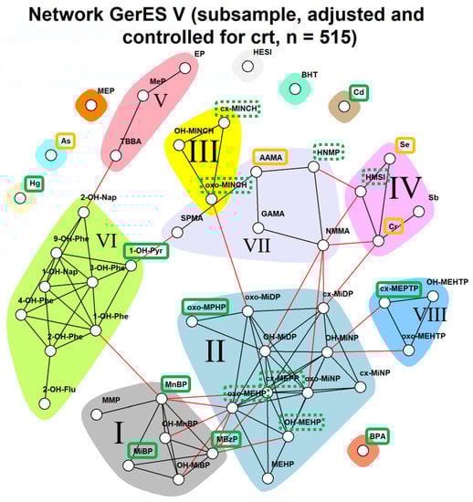 Figure 1 shows the resulting patterns of co-occurring chemicals (depicted in different colors) from the network analysis of the subsample of 515 participants from GerES V when adjusting raw concentrations for creatinine, controlling for creatinine and basic determinants in multivariate analyses in addition. These patterns are referred to as ‘communities’. Several substances were not part of any community, such as some elements (mercury, inorganic arsenic, cadmium), bisphenol A (BPA) and the phthalate MEP. A total of eight communities consisting of three or more substances were observed. These eight communities (mainly) comprised two communities of phthalate metabolites (I, dark grey, and II), DINCH metabolites (III), polycyclic aromatic hydrocarbons (PAHs) (VI), parabens and lysmeral (TBBA) (V), aprotic solvent HNMP, NMMA, acrylamide, its metabolite glycidamide and benzene and its metabolite S-phenyl-mercapturic acid (SPMA) (VII), DEHTP metabolites (VIII), selenium, chromium, antimony and aprotic solvent HMSI (IV). Among the phthalate communities, MMP co-occurred together with BBzP and DnBP and DiBP metabolites (I), while DEHP metabolites co-occurred with propylheptyl phthalate (PHP) and DiNP and DiDP metabolites (II). Thus, communities often reflected the expected co-occurrence of parent chemicals and their metabolites and/or substances from the same chemical family. Additionally, however, also a few communities comprising chemicals from different families were observed.