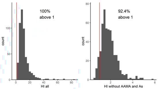 Distribution of hazard indices for all substances with an available guidance value, with and without acrylamide and arsenic. The red line indicates the value of 1.