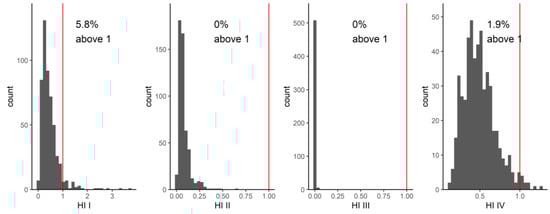 Distribution of hazard indices for communities I to IV. The red line indicates the value of 1. For communities I and IV, a small fraction of the population exceeds an HI value of 1.