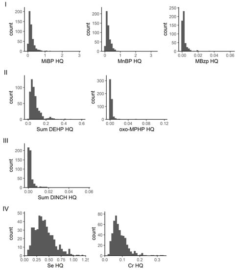 Of the remaining communities, community I contains the phthalate metabolites MiBP and MnBP with high hazard quotients (see also Figure 4), which leads to HI values that exceed the value of one in 5.8% of the individuals studied (Figure 3). With regard to MiBP (mono-isobutyl phthalate), exceedance of the HBM-HBGVs (resulting in an HQ value > 1) was observed for a small fraction (2.3%, 12 of 515) of the population studied, while one out of 515 exceeded HQ > 1 for MnBP. Community IV comprises, among others, the substances chromium and selenium. As shown in Figure 3, using a BE and a BMGV for calculating the hazard quotients resulted in HI values below one in nearly all participants, i.e., HI values > 1 was observed for 1.9% of the individuals studied. In contrast, the HI values obtained for communities II and III, comprising four phthalate metabolites and two DINCH metabolites, respectively, remained well below the value of 1 (Figure 3). Hence, within the current dataset and via the network analysis, in addition to single chemicals, the communities VII and I would pose the highest concern and thus should be given priority when addressing health risks related to combined exposure to multiple chemicals.