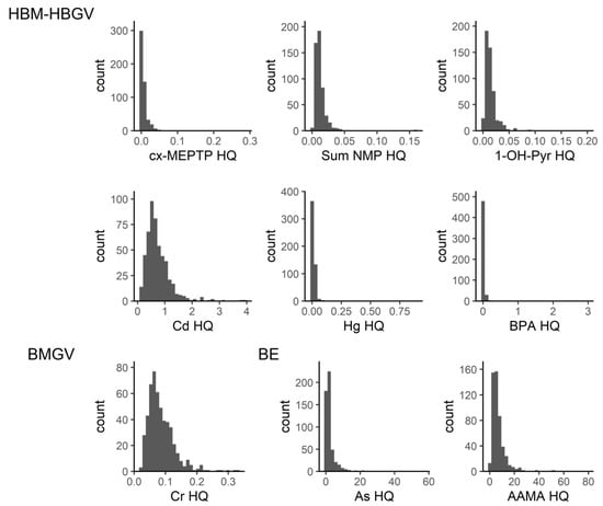 Distribution of individual hazard quotients (HQs) for substances that were not members of a community (see Figure 1) or were the only substances in that community for which a guidance value (HBM-HBGV or equivalent) was identified. The HQs for arsenic and acrylamide are based on BEs (biomonitoring equivalents), the HQ for chromium is based on a BMGV, while the HQs for cx-MEPTP (1-mono-(2-ethyl-5-carboxyl-pentyl) benzene-1,4-dicarboxylate), NMP (N-methyl-2-pyrrolidone), pyrene, cadmium, mercury and bisphenol A are based on HBM-HBGVs.