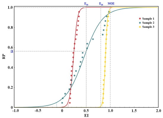 where R is the rank of EI and N is the total number of toxicity endpoints. Using EI as the independent variable X and the corresponding RP as the dependent variable Y, the logistic model is used for fitting. The fitting formula is as follows: