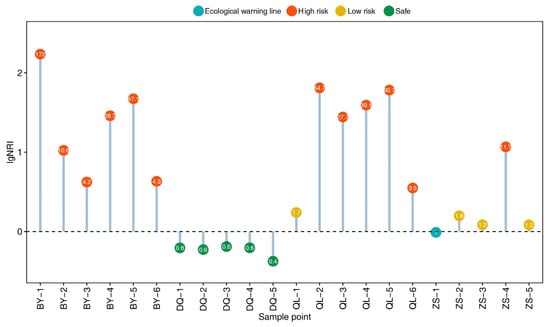 where RImean is the average RI and RImax is the maximum RI. NRI can be divided into five levels: safe (NRI ≤ 0.7); ecological warning line (0.7 < NRI ≤ 1.0); low risk (1 < NRI ≤ 2.0); medium risk (2.0 < NRI ≤ 3.0); and high risk (NRI > 3.0).
