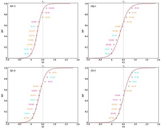 Cumulative probability distribution curve of EI for soil BY−2, DQ−1, QL−6 and ZS−3.