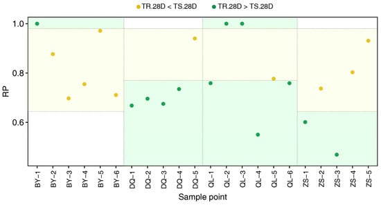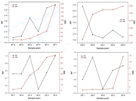 NRI and RP at four sites were further compared and analyzed (Figure 7). In site BY with high NRI, RP increases with the increase of NRI, which is consistent with the result of Spearman correlation analysis (Figure 6). However, the risk probability of BY−2 is higher than expected. In site DQ with low NRI, RP decreased with the increase of NRI, which was contrary to the result of Spearman correlation analysis (Figure 6). Possibly, lower concentrations of pollutants could be beneficial to soil invertebrates, or other soil factors may have exhibited greater effect on invertebrates than pollutants. In site QL with wide span of NRI, there was no monotone correlation between NRI and RP. The toxicity of QL−3 was greater than that expected by NRI, while the toxicity of QL−4 and QL−5 was much less than that expected by NRI. In site ZS, there is no monotone correlation between NRI and RP, and the toxicity of ZS−5 is much higher than that expected by NRI. The above results further indicate that the correlation between NRI and RP may be affected by soil components and physicochemical properties [44].