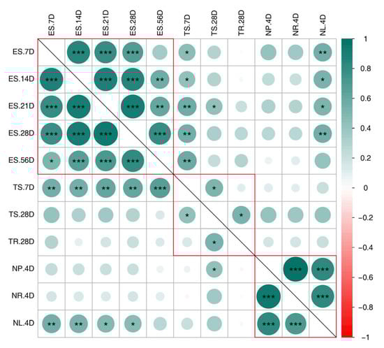 Correlation analysis of toxicity effect index at different toxicity endpoints. The lower−left part is the Pearson correlation, and the upper−right part is the Spearman correlation. (*** p < 0.001, ** 0.001 < p < 0.01, * 0.01 < p < 0.05).
