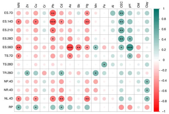 Spearman correlation analysis between toxic effects and soil composition. (*** p < 0.001, ** 0.001 < p < 0.01, * 0.01 < p < 0.05).