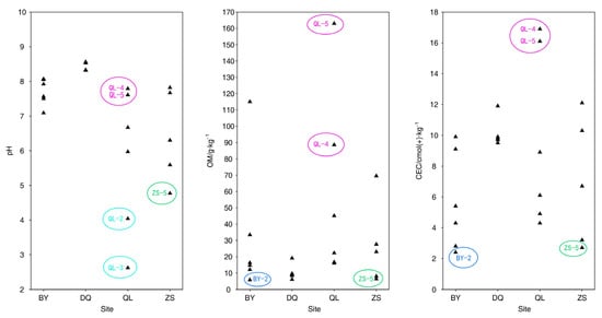 Several studies have demonstrated that soils with higher pH and soil OM content exhibited less toxicity to earthworms and springtails [16,26,45,46,47]. Toxicity studies on nematodes also found that higher CEC and soil OM content were related to low toxicity [39]. The pH, OM and CEC of each soil sample collected from the four sites were significantly different (Table S4 and Figure 8), which was likely to have a great impact on the ecological risk of soil. For example, the high risk of BY−2 may be influenced by the low CEC and OM. The high risk of QL−2 and QL−3 may be affected by the lower pH. The lower risk of QL−4 and QL−5 may be related to the higher OM, pH, and CEC, and low CEC, OM and pH may have had an impact on the high risk of ZS−5. Therefore, the risk assessment based on the EI cumulative probability distribution method could essentially reflect the toxicity of soil to invertebrates, especially the actual combined contaminated soil. The complex interactions among soil pollutants and the effect of soil physicochemical properties were fully taken into consideration. Besides pollutant content, extreme soil physicochemical properties may also have a decisive influence on the life history of soil invertebrates. Taking these factors into account, the risk assessment result could be more convincing in the characterization of soil toxicity. Furthermore, accurate risk assessment could guide risk managers to formulate effective and customized remediation strategies.