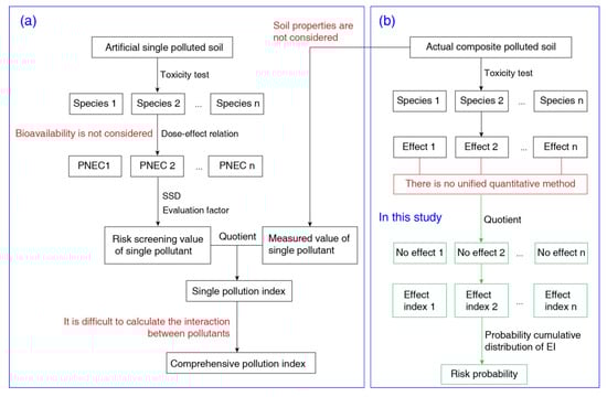 RSVs can roughly screen out potential high−risk pollutants in soil. A single risk index (RI) based on RSVs is commonly used to characterize the ecological risk of single pollutants, and the Nemerow risk index (NRI), based on RI, is used to characterize the overall ecological risk of combined pollutants [8,9,10,11,12,13]. However, the deduction process of RSVs neglects the influence of soil properties on toxicity effects, while NRI overlooks the complex interaction among different pollutants. Therefore, there is a great deal of uncertainty in the ecological risk assessment of combined contaminated soil by RI and NRI (Scheme 1a). In fact, most actual sites were contaminated by various pollutants, especially metal smelting, coking and other industries [11,14,15]. Under combined pollution states, complex interactions among pollutants could affect their bioavailability and biotoxicity, making them different from those under a single contamination state. Therefore, these differences should be fully considered in the formulation of risk assessment methods. Although some studies have established the relationship between toxic effects and soil physicochemical properties, and the relationship between toxic effects and bioavailable concentration, such research data are very limited [16,17,18,19,20]. The combined effects of different pollutants have been investigated and concentration addition (CA) and independent action (IA) models were applied in the risk assessment process [21,22,23]. Nevertheless, the actual contaminated soils were of infinite composition, while the joint effect studies cannot be exhaustive.