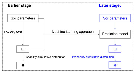Although the ecological risk assessment based on toxicity test is reliable, the cost of toxicity tests is high and the cycle is long. Therefore, in the long run, it is still the most economical and effective method to predict the ecological risk from pollutant content while taking the physicochemical properties of soil into account. However, it is very difficult to use traditional statistical methods to study the correlation between soil composition and toxic effects [48,49]. It has been shown that machine learning algorithms can make acceptable predictions about the relationship between responses and multiple factors. In order to reveal the superposition or confrontation of multiple factors, Yu et al. [50] established a tree−structure−based random forest feature importance and feature interaction network analysis framework (TBRFA), and successfully predicted the microbial composition of global soils under 18 environmental factors [51]. Machine learning methods also show great promise in the construction of prediction models of complex dose–effect relationships, if enough toxicity data of combined contamination are available. Therefore, the use of actual pollutant soil for future toxicity tests is recommended, as is the provision of original tabular data, so as to build an open database of composite pollution and toxic effects and to facilitate the prediction of dose–effect relationships by machine learning methods (earlier stage in Scheme 2). The following soil parameters should be considered: the total content of major pollutants, CEC, pH, and OM. In addition, accurate Latin names of species, trial duration, toxicity endpoint and toxicity effect index (EI) should be provided. Once the prediction model is established and validated, the toxicity effect index of a specific toxicity endpoint of soil can be predicted without further toxicity tests (later stage in Scheme 2). Finally, based on EI predicted by the model, the cumulative probability distribution method can be used to assess the ecological risk of any combined contaminated soil.