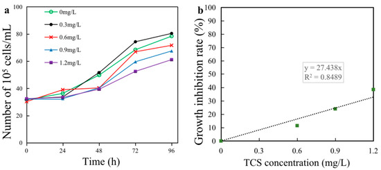 Effect of triclosan (TCS) on the growth of Euglena gracilis. (a) Cell density; (b) growth inhibition rate.