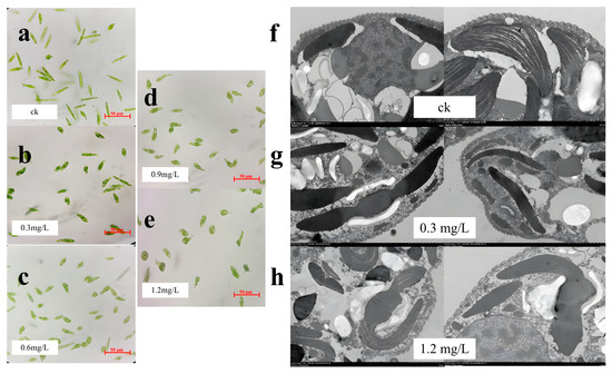 Observations of algal cell morphology. Optical microscope image of the control group (a), 0.3 mg/L (b), 0.6 mg/L (c), 0.9 mg/L (d), and 1.2 mg/L (e) TCS: the morphology changes in E. gracilis; TEM images of the control group (f), 0.3 mg/L (g), and 1.2 mg/L (h) TCS: the ultrastructure of E. gracilis, such as the number of vacuoles and chloroplast arrangement and damage.