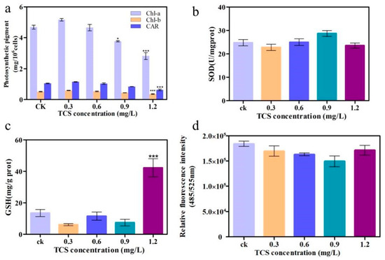 Changes in physiological indicators induced by triclosan (TCS). (a) Photosynthetic pigment content; (b) the activities of superoxide dismutase (SOD); (c) the activities of glutathione (GSH); and (d) the activities of relative fluorescence intensity. * p < 0.05, *** p < 0.001, compared with the control group.