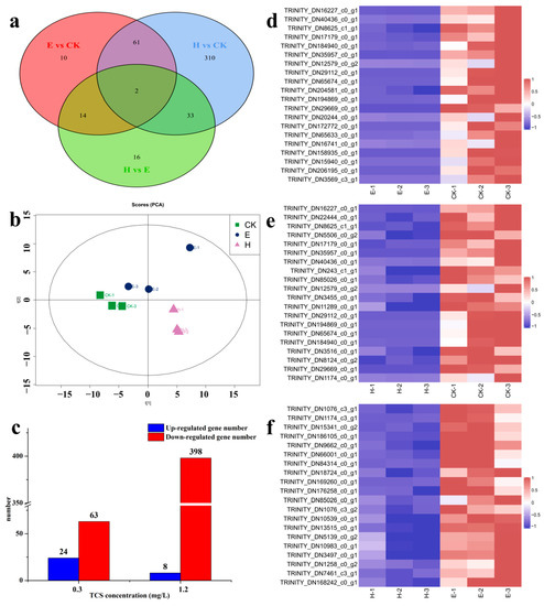 (a) Venn diagram of differentially expressed genes (DEGs); (b) principal component analysis (PCA) for Euglena gracilis; (c) differentially expressed gene (DEG) numbers due to triclosan (TCS) exposure (FDR < 0.05); clustering heat map of the top 20 DEGs between groups; (d) TCS-E (0.3 mg/L) vs. control; (e) TCS-H (1.2 mg/L) vs. control; and (f) TCS-H (1.2 mg/L) vs. TCS-E (0.3 mg/L).