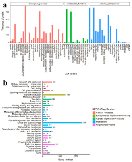 (a) Gene classification of E. gracilis according to the GO database; (b) gene pathway classification of E. gracilis according to the KEGG database.