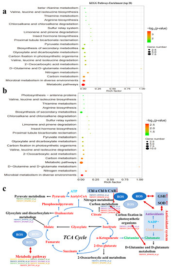 KEGG pathway analysis of Euglena gracilis induced by triclosan (TCS). (a) TCS-E; (b) TCS-H; (c) schematic of the proposed metabolic pathways of Euglena gracilis.