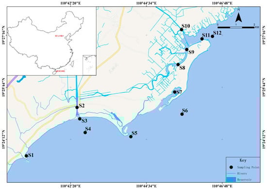Wenchang Fengjiawan is located on the eastern coast of Hainan, with a length of about 15 km and a width of 1~4 km; as an important breeding area in Hainan Province, Wenchang Fengjiawan is surrounded by the most important Dongfeng snail breeding and shrimp fry breeding bases in Huewen Town, and the output value of shrimp fry used to account for more than 70% of the output value of Hainan and about 30% of the country. After decades of development, the Fengjiawan seawater aquaculture industry gradually formed a scale, mainly breeding farming grouper, Dongfeng snails, etc., but also farming South American white shrimp, factory farming, and pond farming, the number of farmers reached a thousand, and farming water surface of more than 10,000 acres. Farmers use a long pumping pipe to the middle of the sea to extract water from the sea floor to the home breeding pool and then use a long drainage pipe to flux the wastewater back to the sea. Surface water was sampled from 12 sites in Fengjiawan, Wenchang (Figure 1). Sampling sites were chosen to rationally reflect the water quality distribution statutes of Fengjiawan, including the sections that were greatly affected by domestic sewage, river inlets, nature reserves, fishing boat moorings, and aquaculture areas. Sampling sites S1–S4 were located in Wenchang Xincun Port; sites S5–S7 were located in Wenchang Bianhai Village Management Area; sites S8–S9 were located in Wenchang Changqi River; sites S10–S12 were located in Wenchang Changji Port. Sampling was conducted in April 2021. The water temperature (T), salinity (SAL), dissolved oxygen (DO), and pH of the water samples were measured in situ using a portable YSI Water Quality Analyzer (3074, USA). Total phosphorus (TP), ammonia nitrogen (NH3−-N), and chemical oxygen demand (COD) were measured by Guowei Yike Environmental Ltd. in accordance with the standard method of the State Environmental Protection Administration (SEPA) of China (SEPA, GB17378.4-2007). All samples were collected in triplicate from each site, kept in an ice box, and transported to the laboratory for immediate treatment.