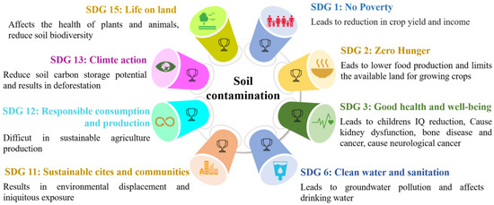 Phytoremediation, impurity immobilization, and soil washing are commonly known techniques that are effective for the remediation of metal-contaminated soil [31]. Despite their efficiency and eco-friendly nature, these innovations have not yet been widely used in non-industrial nations due to inadequate knowledge or awareness. However, major realistic applications of these advancements have been considered effective and applied in developed nations. Additionally, effective communication and community engagement are crucial for ensuring the success of soil remediation efforts. It is essential to involve local communities in designing and implementing soil remediation strategies and to provide them with information about the risks associated with contaminated soil and the potential benefits of remediation [32]. The main effects of soil contamination on sustainable development goals are shown in Figure 1.