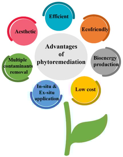 Phytoremediation is a promising soil remediation technique that has gained attention from various experts due to its efficiency, cost-effectiveness, and eco-friendly nature. It involves using plants to remove or degrade contaminants from the soil [44]. The advantages of phytoremediation techniques are shown in Figure 4.