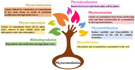 This technique eliminates poisons from soil without requiring the land to be taken away or dealt with. Nonetheless, the viability of phytovolatilization relies upon the toxins present, the plant species utilized, and natural conditions. For example, in the phytovolatilization of Hg, the vaporized Hg can be recondensed and redeposited in the environment, resulting in water and soil pollution. Therefore, phytovolatilization must be utilized cautiously, and ecological conditions, for example, wind speed and direction, must be assessed to limit potential ecological harm [55]. Phytovolatilization is viable in controlling certain environmental pollutants, yet it is not broadly utilized as it has certain limitations. The fundamental disadvantage is the likelihood of airborne toxins causing pollution in surrounding areas. Hence, it is necessary to use this strategy cautiously and only in areas with low population densities or air contamination restrictions exist [44].