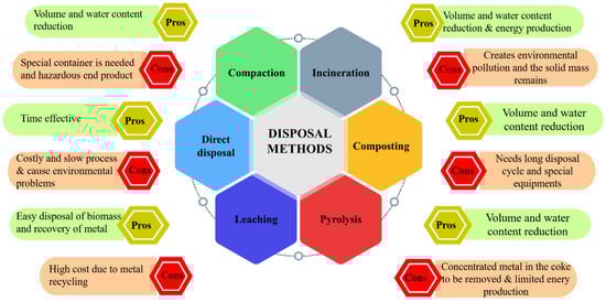 Phytoremediation is an environmentally friendly and cost-effective approach that can be used alone or with other remediation techniques. However, phytoextraction can result in contaminated biomass, which requires proper disposal to prevent further environmental pollution. It is essential to consider the potential environmental impacts of both the phytoremediation process itself and the removal of the resulting contaminated biomass [103]. The six standard methods for disposing of contaminated biomass (composting, landfilling, pyrolysis, leaching, cremation, and direct disposal) each have advantages and disadvantages. They must be carefully evaluated based on the specific circumstances of each site, as shown in Figure 7. Soil treatment involves using microorganisms to break down the contaminants in biomass, while compaction compresses biomass into a dense, stable material. Pyrolysis is a process of thermal degradation that converts biomass into solid, liquid, and gas fractions [104]. Leaching relies on the ability of soluble heavy metals to migrate through a medium, and cremation involves thermal degradation of biomass into treatable-metal-containing ash. Direct disposal is not recommended due to its potential environmental risks. Further research is needed to develop effective and environmentally friendly methods for disposing of contaminated biomass generated from phytoremediation [105].