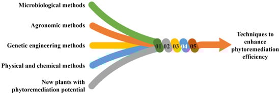 Selecting suitable plant species depends on several factors, such as the type and concentration of contaminants, soil, climatic conditions, and phytoremediation goals. For example, some plants are better suited to the remediation of organic contaminants, while others are more effective in removing heavy metals. In addition to exploring new plant species, developing genetically modified plants can expand the range of phytoremediation options. Genetic engineering can enhance plants’ metal-accumulating capacity, increase their tolerance to toxic contaminants, and change their root systems so that they capture and store contaminants better [45,51]. Overall, continued research and development of phytoremediation technology will be necessary to increase its effectiveness, expand the range of plant species and genotypes available, and address the unique challenges of different contaminants and environmental conditions [108]. A schematic representation of various techniques to enhance phytoremediation efficiency is shown in Figure 8.