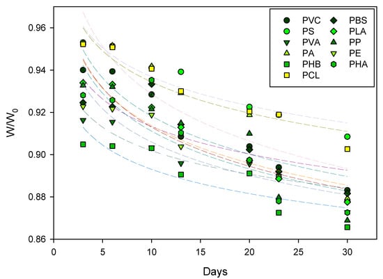 | PVC | 0.13 | 0.89 | 0.0074 | W = W0 × 10−0.007t | 93.34 |