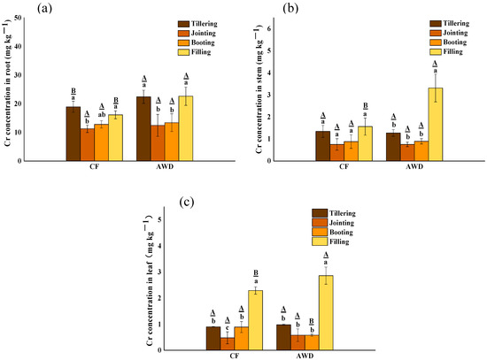 Effects of different water managements on Cr concentrations in roots (a), stems (b) and leaves (c) of rice at different growth stages. The lowercase letters indicate the differences among the same treatment in different periods; the uppercase letters indicate the differences between different treatments in the same period, p < 0.05.
