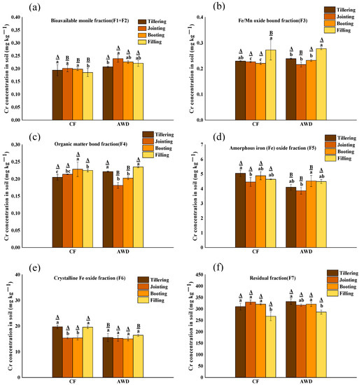 In order to better understand the mobility of Cr in paddy fields, the changes of Cr fractions in different periods and different water management were sequentially extracted (Figure 2). In general, the Cr fraction distribution is F7 (residual fraction) > F6 (crystalline iron oxidation fraction) > F5 (amorphous iron oxide fraction) > F4 (organic matter-bound fraction) > F3 (Fe/Mn oxide-bound fraction) > F2 (carbonate-bound fraction) > F1 (exchangeable fraction). Residual fraction Cr (F7) is the main component of Cr in soil, accounting for more than 90%, indicating that the mobility of Cr is low [46]. In the four growth stages, the concentrations of bioavailable fractions ∑(F1–F2) in CF and AWD were 0.19–0.20 mg kg−1 and 0.20–0.20 mg kg−1, respectively, accounting for only 0.06–0.07% of total Cr. Interestingly, the CF and AWD treatments had significant differences between the bioavailable fractions ∑(F1-F2) and potential bioavailable fractions ∑(F3–F6), respectively. For CF treatment, the ∑(F1-F2) fraction and Fe/Mn oxide-bound fraction concentrations were decreased significantly with rice growth, and organic-bound Cr and residual Cr were increased significantly. This result indicated that the Cr fraction in soil was affected by Fe-Mn oxides in a strong redox state under flooding conditions. This result was in accordance with the latest research [47] that newly released Cr may be re-adsorbed on the surface of minerals and organic matter through electrostatic or physical complexes, resulting in a decrease in bioavailable Cr. However, it is different in AWD treatment; the ∑(F1–F2) fraction and Fe/Mn oxide-bound fraction showed a significant increase with rice growth. In contrast, the organic-bound and residual Cr fraction concentration were significantly reduced with rice growth. It is indicated that organic-bound Cr and residual Cr are significantly reduced and converted into Fe/Mn oxide-bound Cr and bioavailable Cr. The reason could be due to the oxidation of iron, because the oxidation of Fe(II) produces amorphous iron hydrates with poor crystallinity [48]. In summary, it can be seen that compared with CF treatment, AWD treatment increased the content of bioavailable and potential bioavailable component Cr in the soil and increased the absorption of Cr by rice.