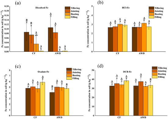 The concentration distribution of different fractions of Fe in soil under different water management treatments at different growth stages of rice. The lowercase letters indicate the differences among the same treatment in different periods; the uppercase letters indicate the differences between different treatments in the same period, p < 0.05.