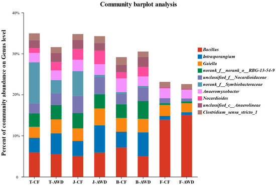 The relative community abundance of the top 10 soil bacteria on genus level in different treatments. T represents the Tillering stage; J represents the Jointing stage; B represents the Booting stage; F represents the Filling stage. CF refers to continuous flooding. AWD refers to alternate wet and dry irrigation.