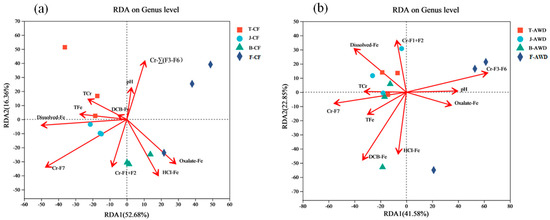 The redundancy analysis (RDA) between bacterial community and related environmental variables of continuous flooding treatment (CF) (a) and alternative wet and dry treatment (AWD) (b) at genus level. TCr and TFe represent the Total Cr and the Total Fe, respectively; Cr-F1+F2 represent the bioavailable fractions of Cr; Cr-∑(F3–F6) represent potentially bioavailable fractions of Cr; Cr-F7 represents the residual fractions of Cr. (T represents the Tillering stage; J represents the Jointing stage; B represents the Booting stage; F represents the Filling stage.).
