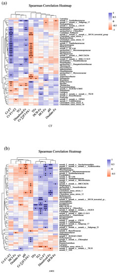 In this paper, redundancy analysis (RDA) was used to determine the correlation between soil environmental variables and soil microbial community composition (Figure 5). RDA analysis showed that at the genus level, the relevant environmental variables explained 69.04% and 64.43% of the community composition of CF treatment (Figure 5a) and AWD treatment (Figure 5b), respectively. Compared with other environmental variables, dissolved-Fe (p = 0.048), Cr-F7 (p = 0.015) and Cr-∑(F3–F6) (p = 0.096) had significant effects on microbial community composition. Dissolved-Fe (RDA1 = −99.85%, r2 = 0.50, p = 0.048) and Cr-F7 (RDA1 = −85.21%, r2 = 0.64, p = 0.015) were significantly negative related with RDA1, while TFe (RDA1 = −99.07%, r2 = 0.15, p = 0.484), TCr (RDA1 = −87.01%, r2 = 0.14, p = 0.533) and DCB-Fe (RDA1 = −88.22%, r2 = 0.01, p = 0.989) were critical for explaining the variations in community structure in CF treatment. The soil pH (RDA1 = 99.18%, r2 = 0.17, p = 0.455), Cr-∑(F3–F6) (RDA1 = 99.48%, r2 = 0.45, p = 0.096), TCr (RDA1 = −98.53%, r2 = 0.12, p = 0.571) and Cr-F7 (RDA1 = −99.99%, r2 = 0.35, p = 0.140) were critical factors explaining the variations communities in AWD treatment. Some scholars have shown that soil moisture has the greatest impact on the composition of microbial communities in the 0 cm surface soil, and pH may be the main reason for the stratification of the 20 cm surface soil. In addition, the composition of microbial communities below 40 cm is mainly significantly affected by total Cr [53]. In the RDA plot, the angle between the 2 factor vectors is less than 90°, indicating a positive correlation between them. It can be seen from Figure 5a that TCr is positively correlated with TFe and dissolved-Fe under CF condition, while TCr is positively correlated with TFe, Cr-F7 and dissolved-Fe under AWD condition. It shows that the Cr content in the soil is greatly affected by the effective state of iron. Similarly, the RDA results of Xiao et al. [65] also showed a close correlation between microbial community composition and soil pH and Fe(II) concentration.
