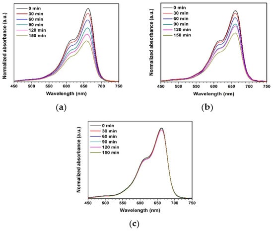 Normalized absorbance of MB solution under UV light using different photocatalysts: (a) ZnO precipitation, (b) ZnO combustion, and (c) blank.