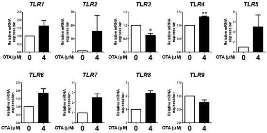 Ochratoxin A affects Toll-like receptor signaling in IPEC-J2 cells. The relative mRNA levels of Toll-like receptor genes (TLR1, TLR2, TLR3, TLR4, TLR5, TLR6, TLR7, TLR8, and TLR9) after treatment with 4 μM OTA4 compared with the untreated group. * p < 0.05 and ** p < 0.01 indicate significant differences between control and treatment groups. Each error bar represents the standard errors (sEs) of the analysis, which was conducted in triplicate.