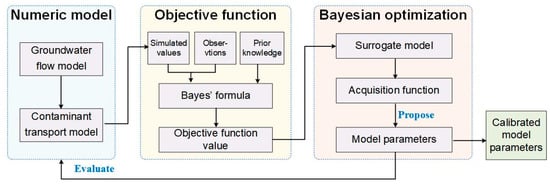 Figure 1 illustrates the BO framework for calibration of the numeric model of groundwater contaminant transport. Given the numeric models of groundwater flow and contaminant transport, we first choose the target parameters to be calibrated. Then, an objective function is formulated to quantify calibration criteria. We use the Bayes’ rule to convert the calibration criteria into the objective function, in which we measure the fitness of simulated values to the observations and prior knowledge. To find the calibrated model parameters, the objective function is minimized by the BO method, in which the minimum of the objective function (i.e., optimized model parameters) is progressively searched in an iterated process. To reduce the expensive objective evaluations, the probabilistic surrogate model replaces the objective function in the BO method. In terms of the surrogate model, the acquisition function is defined to propose new model parameters for minimization of the objective function. Through specified numbers of BO iterations, the calibrated model parameters that well fit the calibration criteria can be obtained.