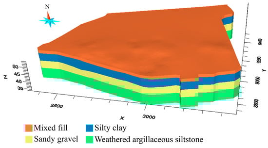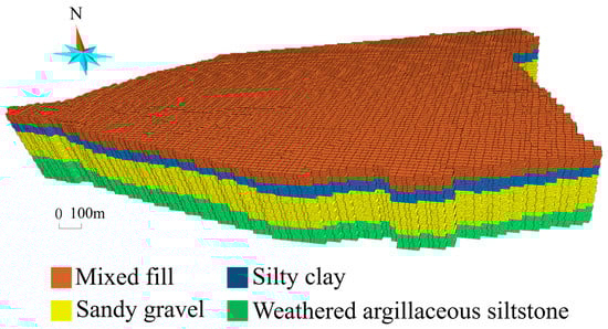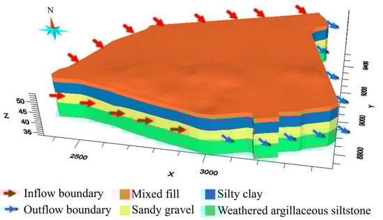 The Cr(VI)-contaminated site is located on an alluvial stratum with fairly flat terrain. According to the engineering geology survey of the site, the alluvial stratum comprises four layers, including mixed fills, silty clays, sandy gravels, and weathered argillaceous siltstones from surface to depth. Table 1 summarizes the settings for the four layers. The layers of sandy gravels, which contain the confined pore water, are treated as a confined aquifer. The aquifer is characterized by weak permeability at its top and bottom boundaries, which can be regarded as an aquiclude due to the low vertical permeability. The major aquifer recharge comes mainly from the lateral flow of groundwater and rainfall. The recharge is considered to be uniform over the boundary, and lateral flow is roughly from northwest to southeast across the site.
