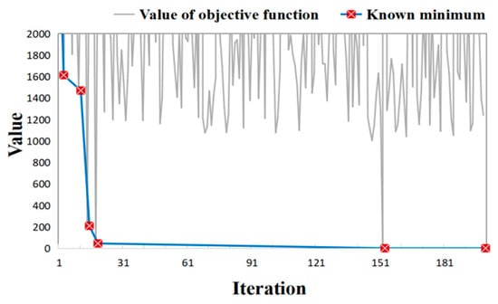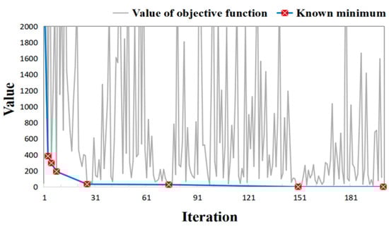 Variation of objective function values and the associated known minima during the BO process in hypothetical case.
