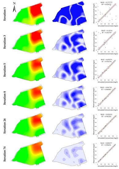 Figure 8 illustrates the evolution of model performance during the BO iterations, in which the rows correspond to the iterations (except the first one) in Table 4 that find better solutions than the known minima. Analogous to the values of the objective function in Figure 9, the simulation errors are remarkably decreased, which demonstrates the ability of the BO to eliminate the simulation errors for the contaminant transport model.