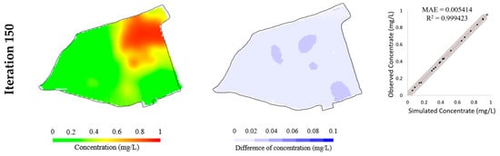 Evolution of simulated concentrations (left column), their differences from observed concentrations (middle column), and scatters of simulated versus observed concentrations (right column) during the BO process in hypothetical case.