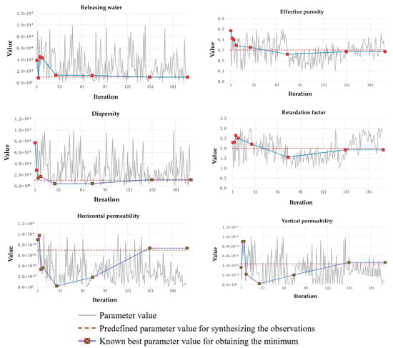 Figure 10 illustrates the variations of model parameters during the BO process, which further shows, by probing the objective function, how the model parameter space is explored. As observed in Figure 10, with the accumulated evaluations of objective functions, the values of parameters gradually approach their “true” values. This demonstrates that, given a limited number of objective function evaluations, the BO method can reasonably identify the model parameters for a relatively ideal contaminant transport system.